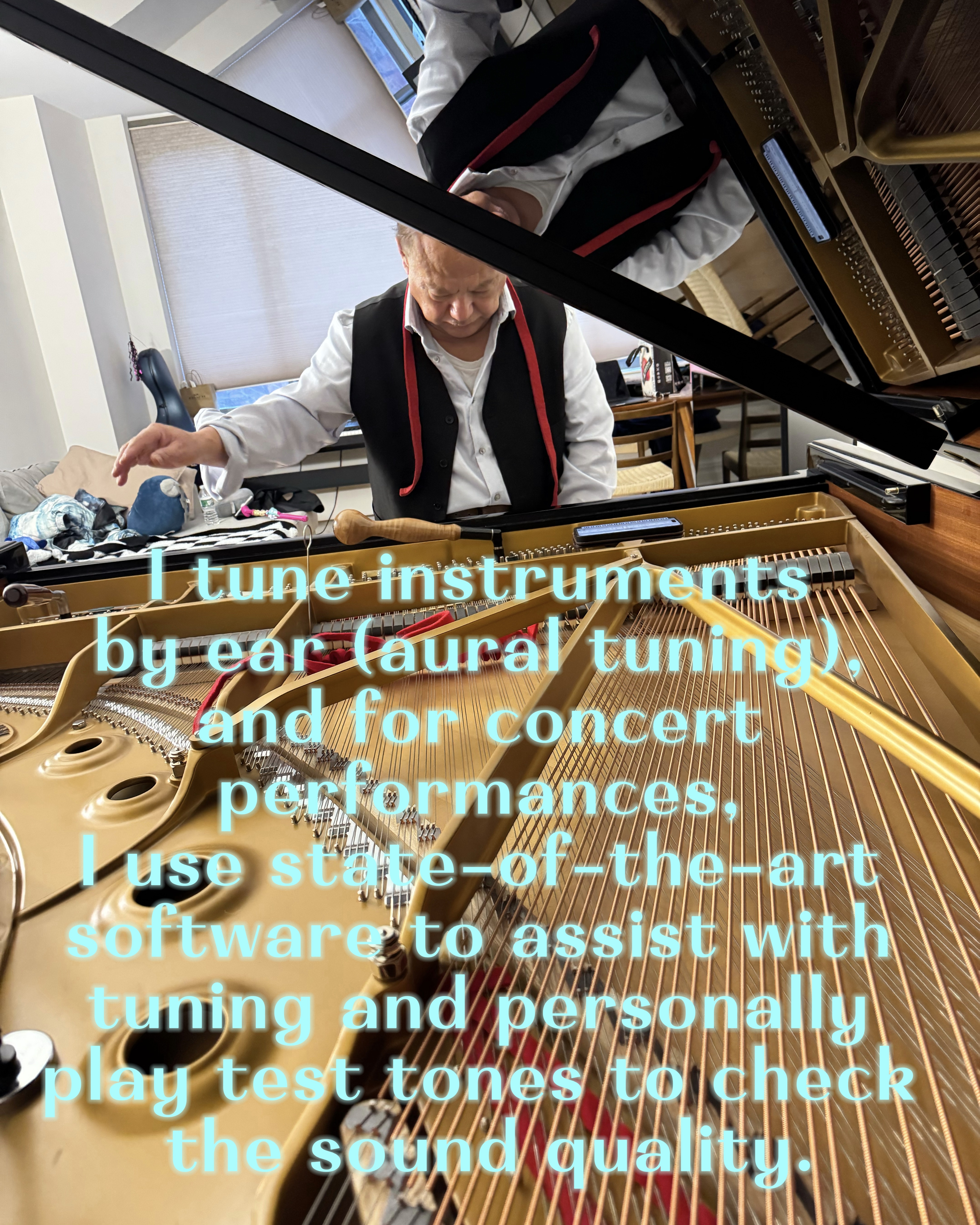 My expertise includes all aspects of piano tuning and servicing, including piano regulating, piano voicing, piano repairs, piano evaluations and more. I tune by ear alone, which allows the nuances of the piano to be felt and heard. I will also be using the latest software to improve the tuning curve.