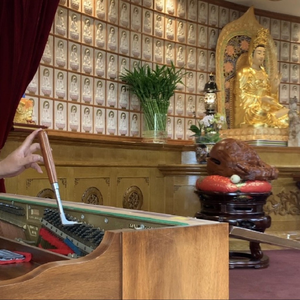 佛教创立之初就使用音乐,以“清净和雅”的吹唱来演说经法。约在公元前 3世纪后,佛教音乐随着佛教逐步向亚洲和世界各地流传。在美国佛教音乐吸收着不同国家的民族民间音乐,从而产生不同风格的佛教音乐。非常欣慰在寺庙的钢琴上面使用十二平均律的调律同时也考虑到五声调式,也是一次有意义的尝试。感谢寺庙主持给我这样一个机会,特别是得以参拜和敬募香火。