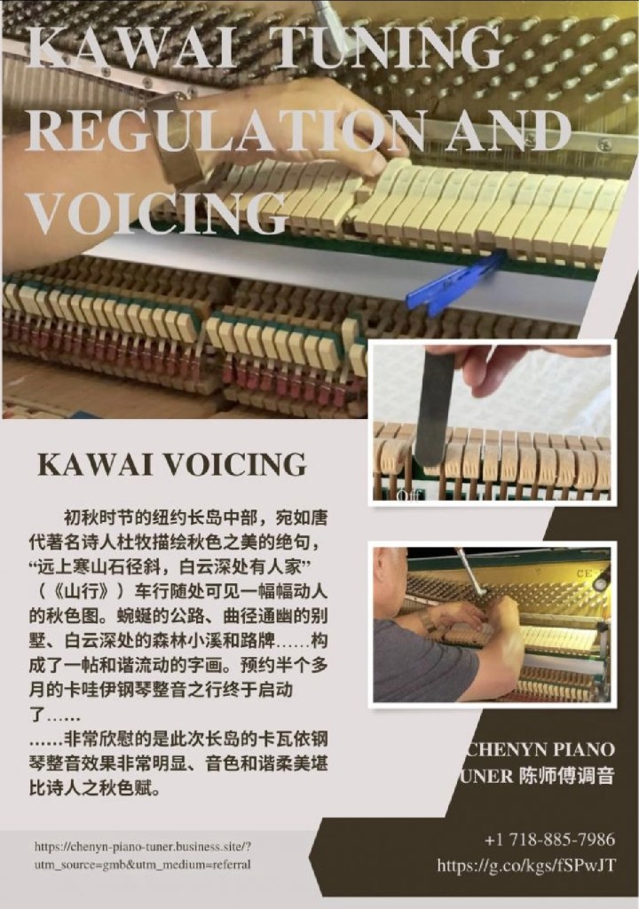 初秋时节的纽约长岛中部,宛如唐代著名诗人杜牧描绘秋色之美的绝句,“远上寒山石径斜,白云深处有人家”(《山行》)车行随处可见一幅幅动人的秋色图。蜿蜒的公路、曲径通幽的别墅、白云深处的森林小溪和路牌……构成了一帖和谐流动的字画。预约半个多月的卡哇伊钢琴整音之行终于启动了……