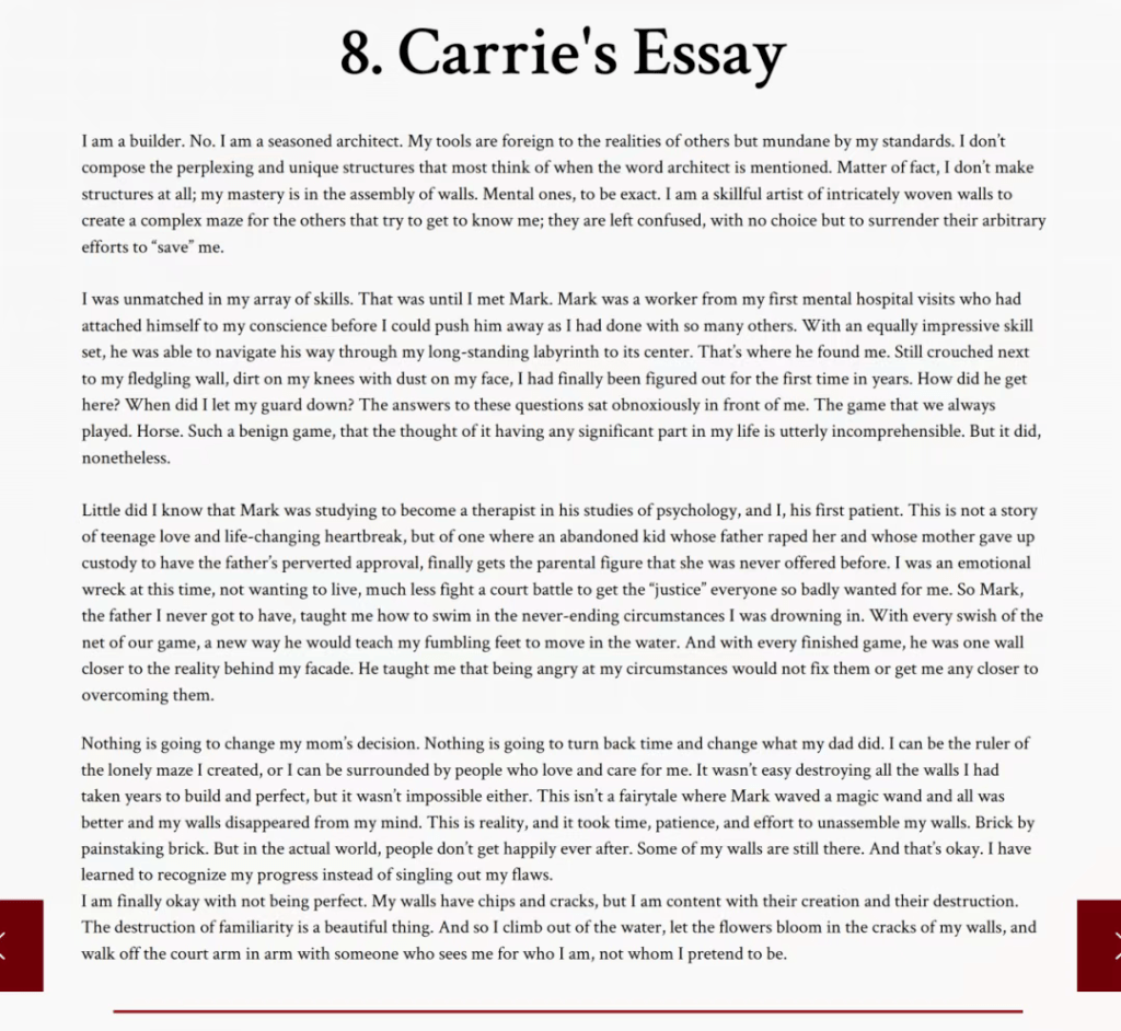 没有什么能改变我妈妈的决定。没有什么能让时光倒流,改变我爸爸的所作所为。我可以成为我创造的孤独迷宫的统治者,也可以被爱我、关心我的人包围。摧毁我多年来建造和完善的所有墙壁并不容易,但也并非不可能。 这可不是马克挥动魔杖,一切就都好了,我的心墙也从我脑海中消失了的童话故事。这就是现实,我花了时间、耐心和努力才拆掉我的心墙。一砖一瓦,煞费苦心。但在现实世界中,人们不会从此过上幸福的生活。我的一些心墙仍然存在。这没关系。我学会了认识到自己的进步,而不是挑出自己的缺点。