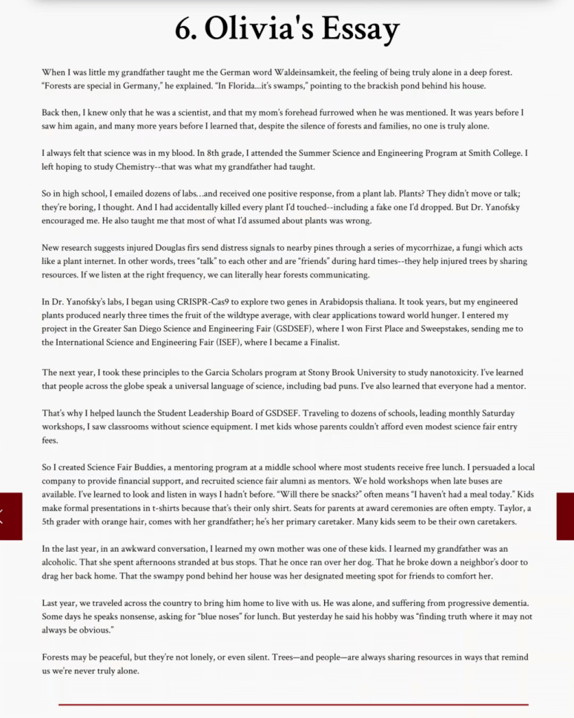 在亚诺夫斯基博士的实验室里,我开始使用 CRISPR-Cas9 技术探索拟南芥中的两个基因。这花了数年时间,但我的转基因植物的产量几乎是野生型平均产量的三倍,这对于解决世界饥饿问题有着明显的应用价值。 – 我的项目参加了大圣地亚哥科学与工程博览会 (GSDSEF),并赢得了一等奖和抽奖,这让我有机会参加国际科学与工程博览会 (ISEF),最终入围决赛。