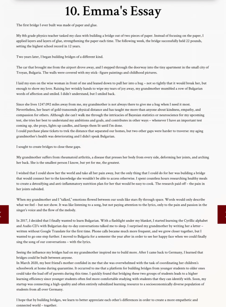 2017年,我终于决定学习保加利亚语。我用手电筒在毯子下学习西里尔字母,而收录了保加利亚日常对话的音频CD让我安然入睡。我给了祖母一个惊喜,第一次没有用谷歌翻译给她写了一封信。电话联系变得更加频繁,我们之间的关系也更加亲密,但我想更进一步。第二年,我搬到保加利亚待了一个学期,就为了看到她笑逐颜开的样子,等我们终于可以唱出我们对话的歌曲——还有歌词的时候。看到我的桥梁对祖母的影响,激励我去建造更多桥梁。来到这里之后 回到德国后,我明白了,人与人之间可以建立桥梁。