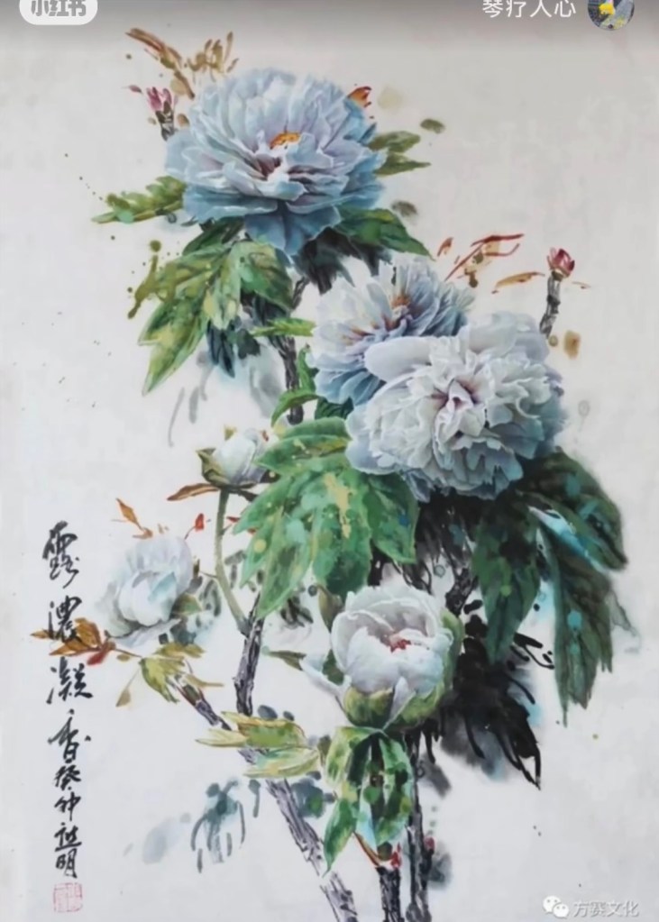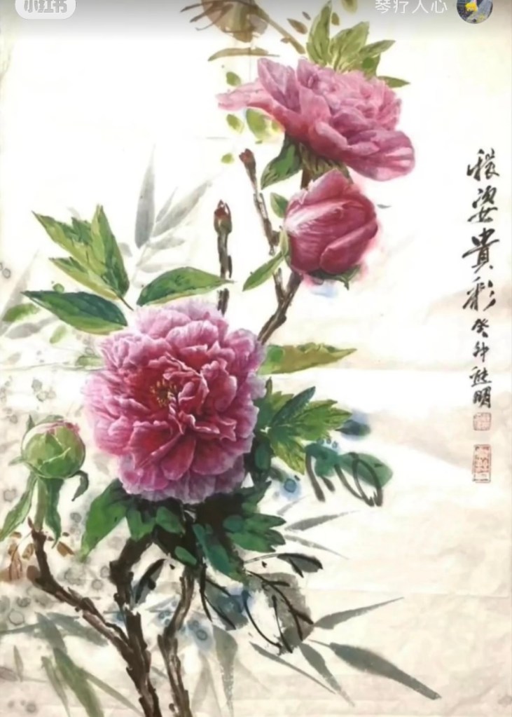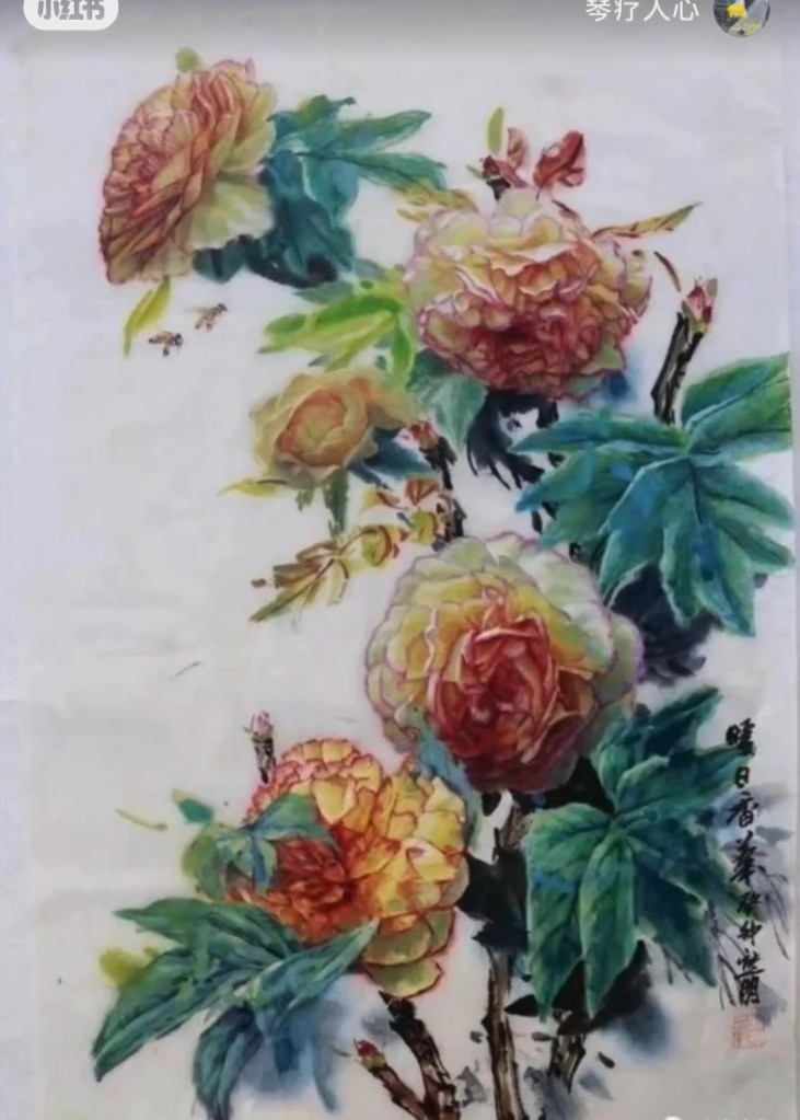 我最喜欢他画牡丹是在宣纸上画油画水彩,栩栩如生的牡丹与叶子的交织让我时常想起儿时的许多情景……是的……笔墨如人、柔情似水、传神佳作,意蕴留长……
