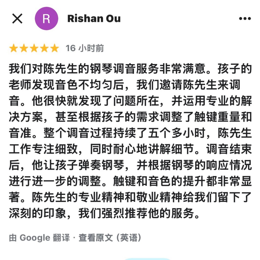 We are extremely satisfied with Mr. Chen’s piano tuning service. After our child’s teacher noticed uneven tone, we invited Mr. Chen to tune our piano. He quickly identified the issues, applied professional solutions, and even adjusted the touch weight and tuning to fit our child’s needs. The entire process lasted over five hours, during which Mr. Chen worked with remarkable focus and precision, while also patiently explaining details along the way. After the tuning, he had our child play and made further refinements based on the piano’s response. The improvement in both touch and tone was remarkable. Mr. Chen’s professionalism and dedication left a deep impression on us, and we highly recommend his services.