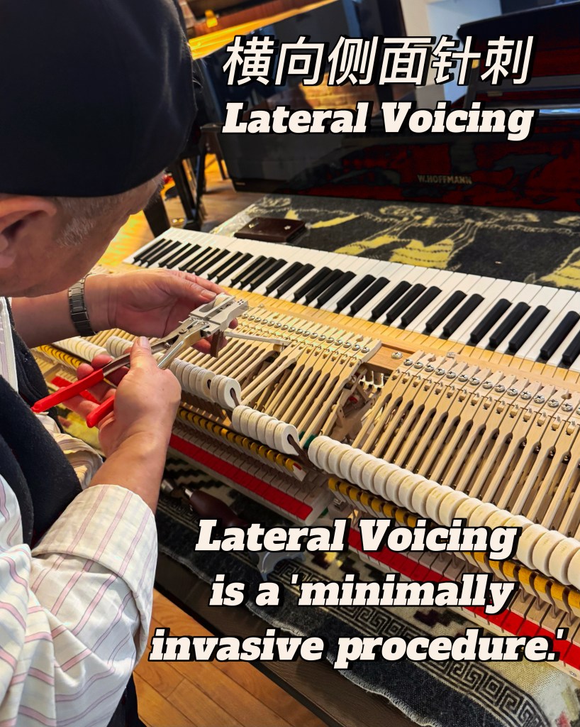 横向侧面针刺(Lateral Voicing)的真正魅力,在于它重塑了钢琴的‘衰减曲线’。 传统的表面针刺往往通过牺牲亮度来换取柔和,但音色往往变得单薄、衰减过快。而通过横向刺入榔头核心区,我们在不损伤击弦点能量传导的前提下,调整了榔头的内张力。这使得击弦瞬间的能量转换从‘碰撞’升华为‘耦合’,从而极大地延长了基音的余振时间。这就是为什么经过横向整音的 W. Hoffmann,能散发出一种如同顶级男高音般的‘歌唱性延音’。”