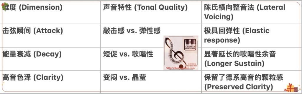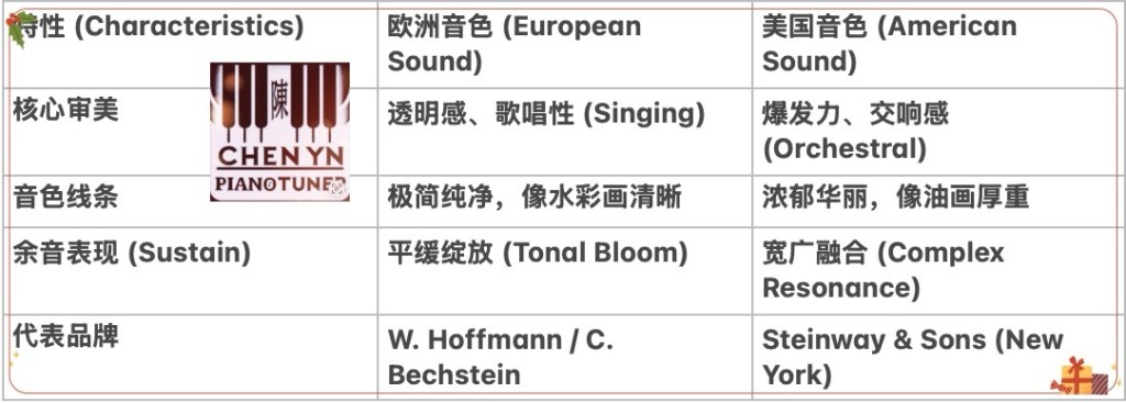 美国音色(American Sound)如施坦威(steinway&Sons)的泛音极其密集且宽广,其审美的核心是爆发力和交响感;无论是音色还是线条都具有浓郁和华丽的宽广及油画般的厚度(Thickness)”与“融合感(Blend)”,在英文环境中我非常欣赏的词组为 “Enhanced Tonal Bloom”(音色的绽放感)或 “Optimized Decay Profile”也被许多国人称之如同顶级高音般的‘歌唱性延音’。