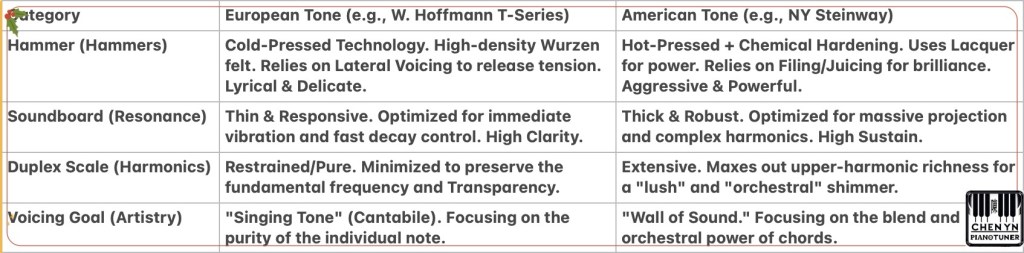 近年来在美国多次接触欧洲钢琴对欧洲音色 (European Sound) 诸如 W. Hoffmann等品牌基音的清晰度,泛音列整齐且透明度、强调“纯净度(Purity)”与“方向感(Clarity)”、特别是Cold-Pressed (冷压)技术等,这是区别于普通琴“热压”工艺的灵魂。W. Hoffmann 这种德系欧洲音色手工琴的原始张力暨血统……唤醒了我对德系纯净音色的工匠探究底气。