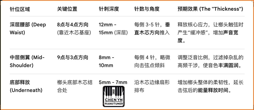 我的核心技法:首先是在8点与4点位置的深层寻踪,针对低音区的“厚度”与“余音”处理,采取了深层根部针刺法。其次就是针位选择避开敏感的击弦冠部,重点切入榔头侧翼的靠近木芯的基座。操作细节是使用三针或五针工具,以垂直于木芯的角度平稳推入,深度达 12mm-15mm。第三反馈到手感上,Abel 榔头的纤维极具韧性。在针刺推入过程中,我能感觉到针尖从最初的“胶着抵触”逐渐过渡到“松动释然”。这种阻力的变化,正是内部应力被释放的信号。处理后的效果是立竿见影的,最显著的变化在于余音(Sustain)明显变长。通过针对性的深层针刺技术,成功地将原本干涩、短促的低音,转化为深沉且具有长余音的音色。