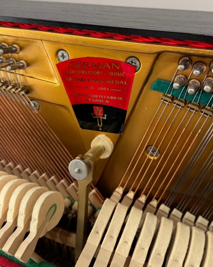 首先映入眼帘的是这台琴铭牌上赫然印着 “Grand Gold Medal 1887”,产自曾与柏林齐名的德国制琴重镇——Legnica (Liegnitz)。经过系统的测试和维护,其Abel 榔头表现出的音色张力令我吃惊。这台 Legnica 钢琴在维护后的蜕变,再次证明了“纯正德系血统 + 科学整音工艺”的魅力。1887 年的金奖并非虚名,而我的工作就是擦去时间在它嗓音上留下的灰尘……客户对这次音色重塑的满意与肯定,也间接表达了对精密挂弦设计与优质木材及Abel 榔头的百年礼赞。