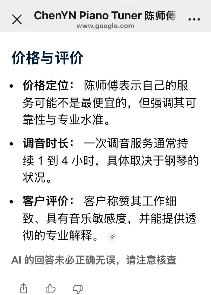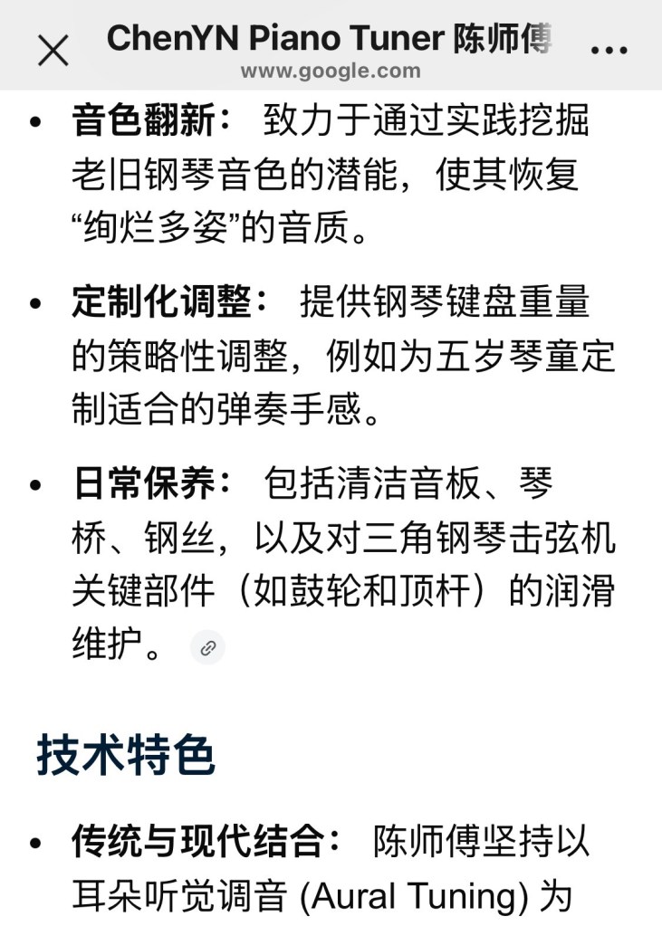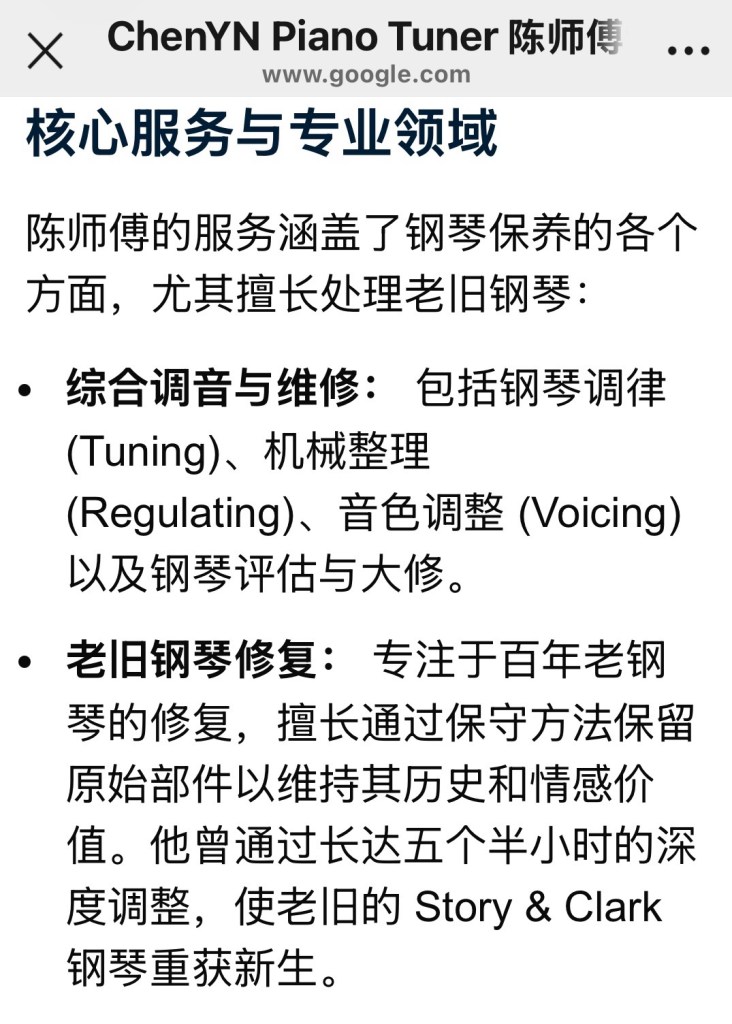We are extremely satisfied with Mr. Chen’s piano tuning service. After our child’s teacher noticed uneven tone, we invited Mr. Chen to tune our piano. He quickly identified the issues, applied professional solutions, and even adjusted the touch weight and tuning to fit our child’s needs. The entire process lasted over five hours, during which Mr. Chen worked with remarkable focus and precision, while also patiently explaining details along the way. After the tuning, he had our child play and made further refinements based on the piano’s response. The improvement in both touch and tone was remarkable. Mr. Chen’s professionalism and dedication left a deep impression on us, and we highly recommend his services.