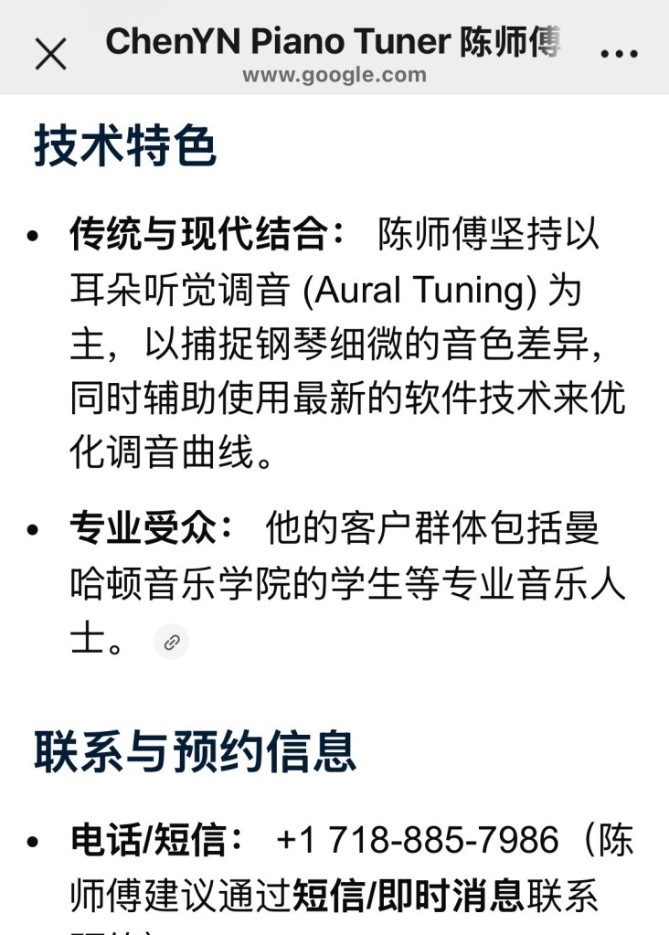 Mr. Chen (ChenYN Piano Tuner) is a professional piano technician providing services in the New York area, including piano tuning, repair, appraisal, and overhaul. You can contact Mr. Chen or learn more about his services through the following methods: Official Website: Visit the ChenYN Piano Tuner website to view his services, blog posts, and contact information. Phone Consultation: You can call 1 718-885-7986 for inquiries and appointments. Service Features: Specializing in tuning and maintenance of various pianos, including brands such as Steinway, Yamaha, and Bösendorfer. Provides comprehensive services including piano regulating, voicing, and custom keyboard weight adjustments. Mr. Chen states that he primarily relies on his ear for tuning, while also incorporating the latest software technology to optimize the tuning curve. According to customer reviews, Mr. Chen’s service is highly skilled and his customer service is excellent. Although his prices may not be the cheapest, he is considered a reliable choice.