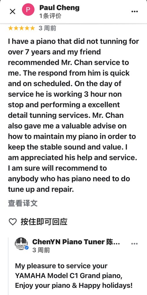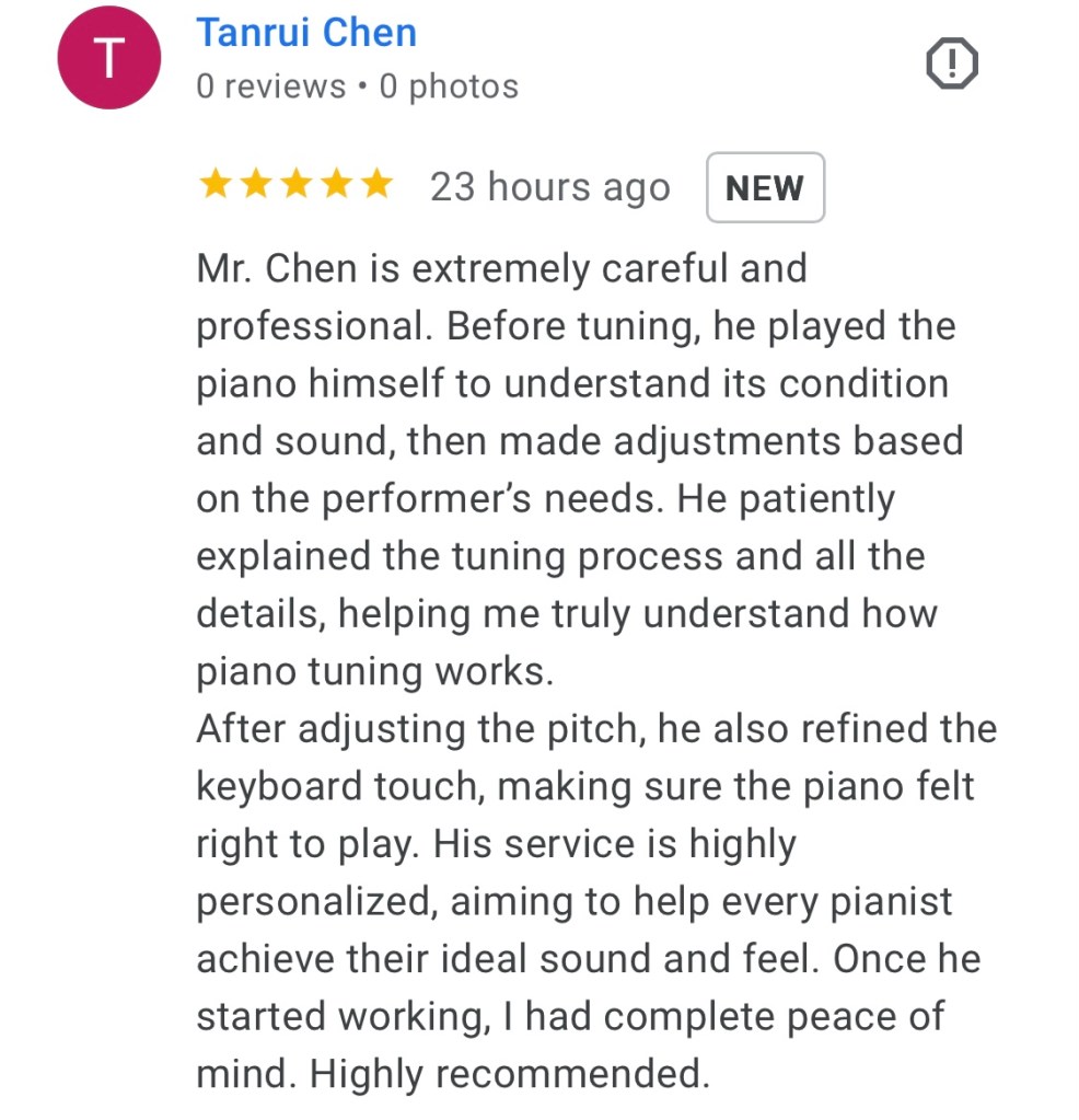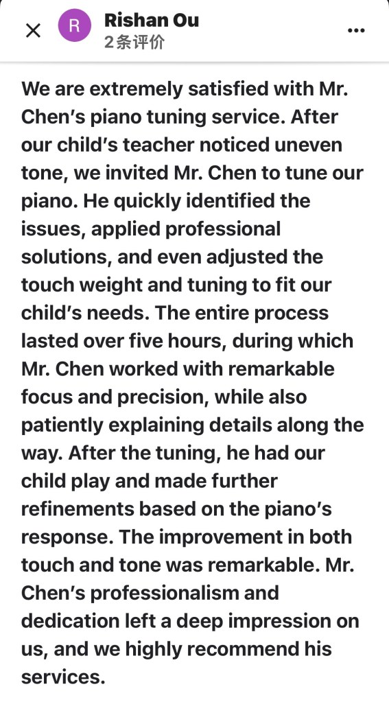 New York Piano Tuner : I used ear tuning (also known as auditory tuning) and state-of-the-art software-based electronic tuning equipment for sound tuning. (The frequency for home concert tuning is 442 Hz.) 我采用耳调音法(也称听觉调音法)和最先进的基于软件的电子调音设备进行调音。(家用音乐会调音的频率为 442 Hz) Chen YN 调音主页